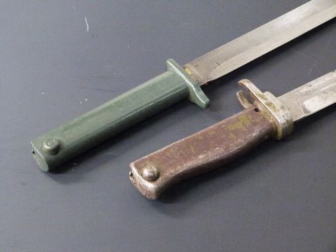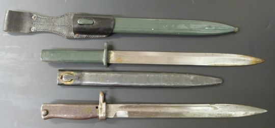 Two German Ersatz all steel bayonets, both with acceptance stamps, one stamped 772 to crosspiece, with 31cm blade, the other 31.5cm both with scabbards and one frog
