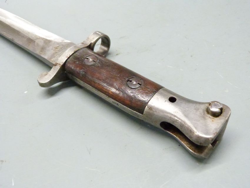 British 1888 pattern bayonet, Mk3 with some clear stamps to ricasso, 30cm blade, with scabbard and frog