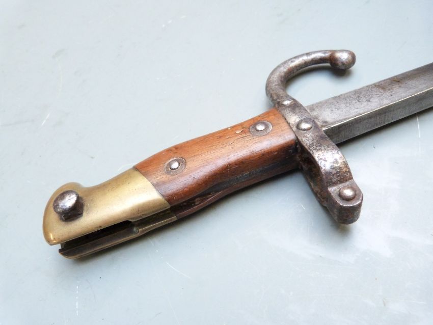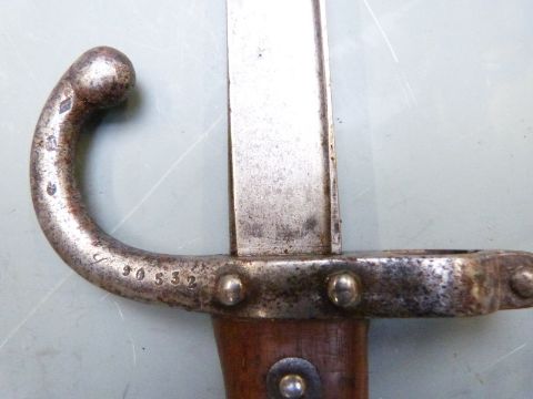 French 1874 pattern Gras bayonet with some clear stamps, downswept quillon, manufacturer's name Ano 1877 to T backed blade, with scabbard