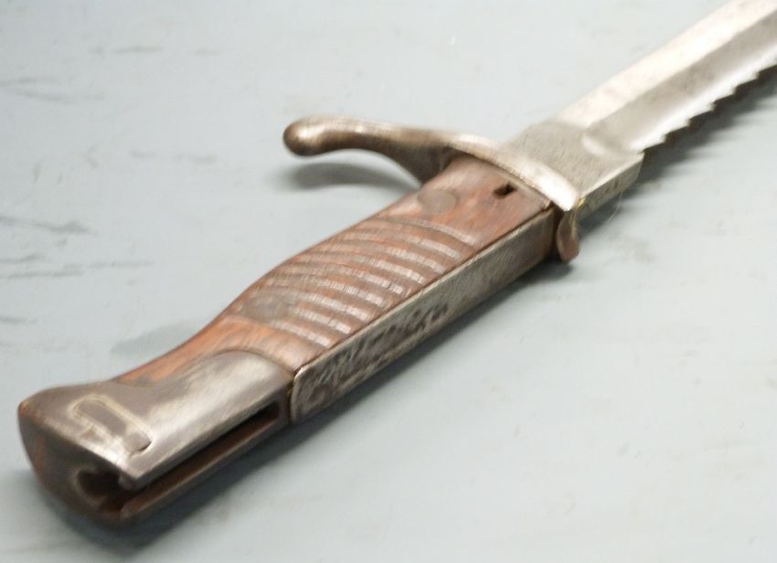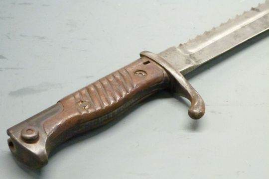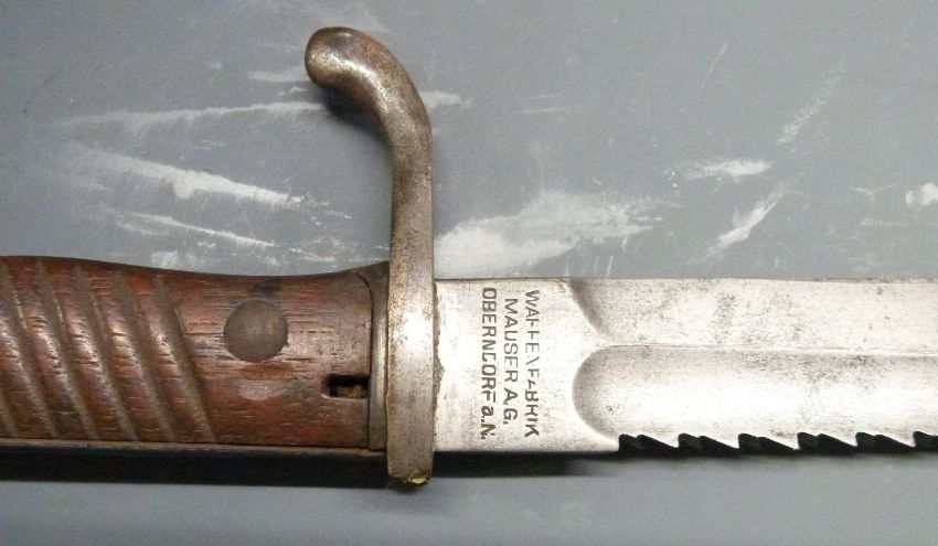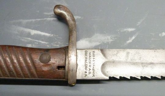 German 1898/05 pattern sawback bayonet, later type with trimmed muzzle ring and flashguard, some clear stamps, Waffenfabrik to 37cm sawback fullered blade, with scabbard