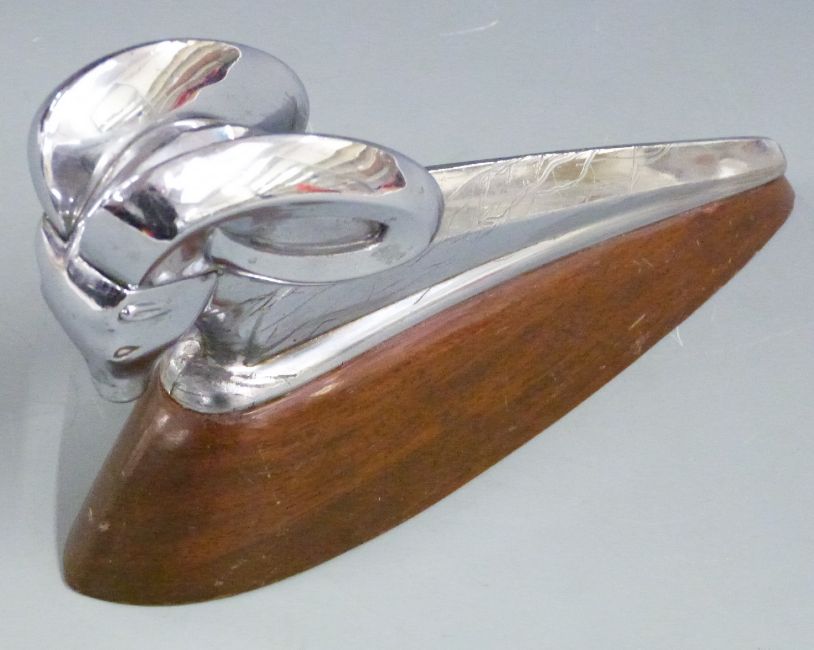 Dodge ram 1950's car mascot or hood ornament, on wooden display base, length 23.5cm