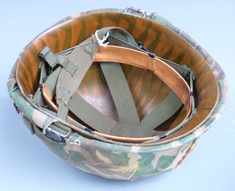American style helmet named to SSgt G Bacon, with camouflage cover and liner together with a British Army example
