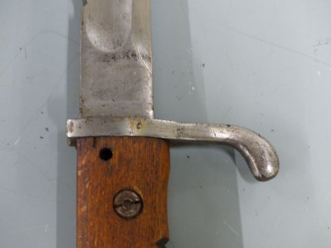 German 1914 pattern Gottscho sawback bayonet stamped G within the device, with one piece wooden grip, 37cm sawback fullered blade scabbard and frog. This actual bayonet is illustrated in the bayonet book Watts/White plate number 282