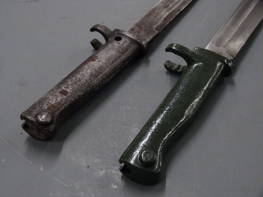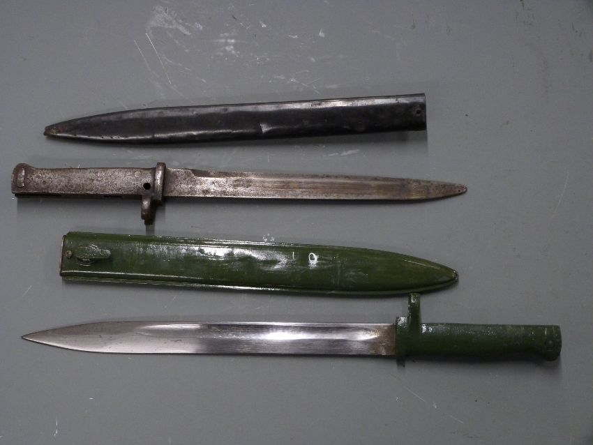 Two German 88/98 pattern Ersatz all steel bayonets, one with a 31cm fullered blade, the other with a 25.5cm blade, both with scabbards, one stamped FAG
