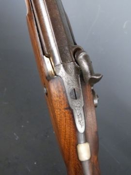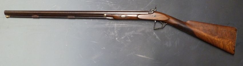 William Dudley 16 bore percussion hammer action gun with named lock engraved with bird scenes, engraved hammer, top plate and pineapple finialled trigger guard, chequered grip, steel butt plate and mounts, brass tipped wooden ram-rod and 28.5 inch smooth bored barrel, overall length 114cm.