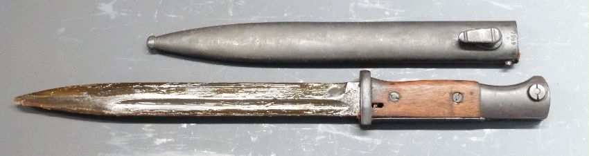 German 84/98 pattern bayonet with flashguard, 6080 11FFC to ricasso, 25cm fullered blade and 5178. G/7969 to scabbard