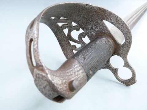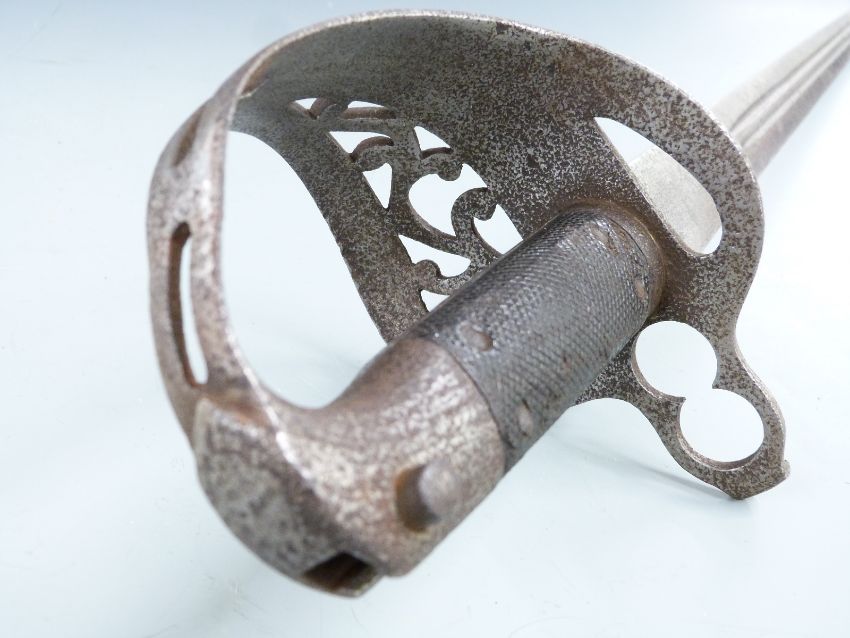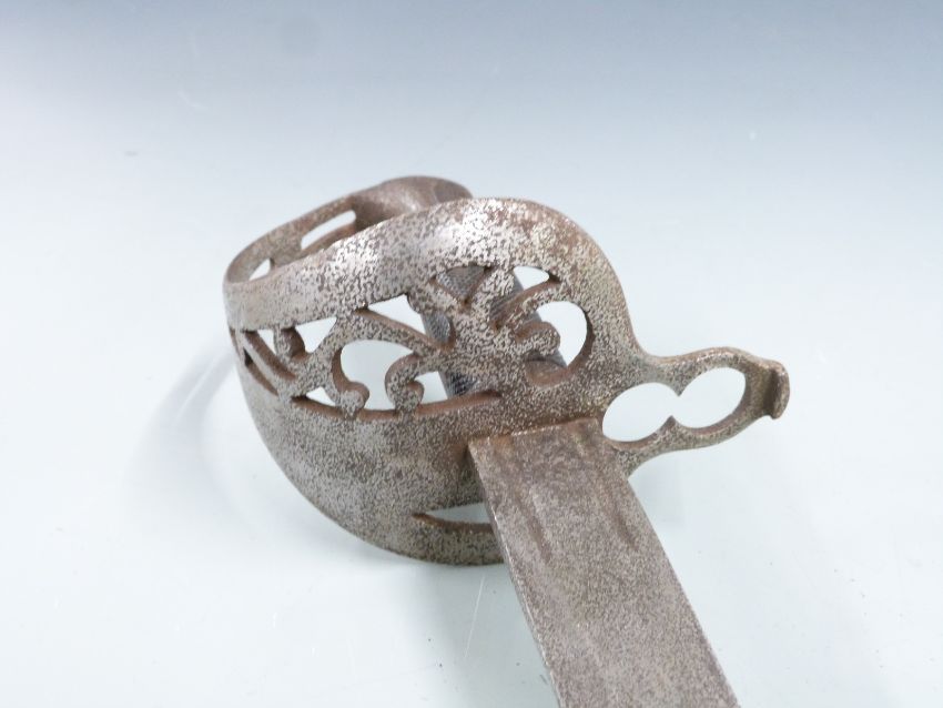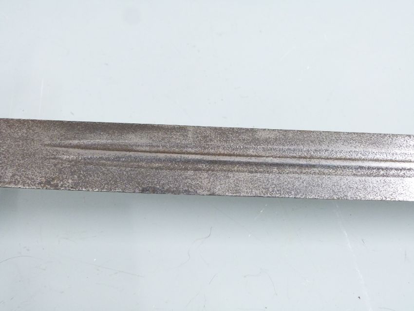 British c1860 sword bayonet for the Jacobs double barrelled rifle, with pierced basket guard, double muzzle ring and double edged twin fullered 85cm blade.