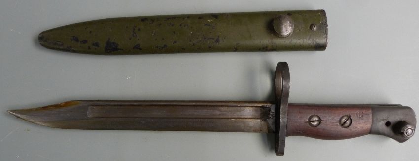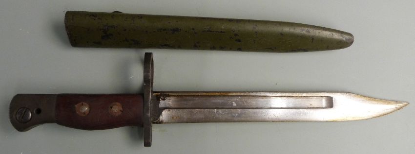 British No5 Mk1 pattern knife bayonet stamped 187 to ricasso, with large muzzle ring, 20cm 'bowie' style blade and scabbard