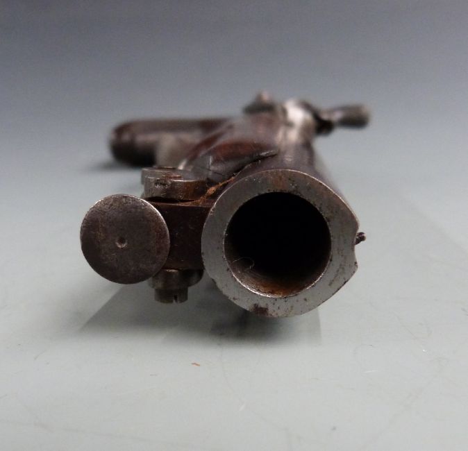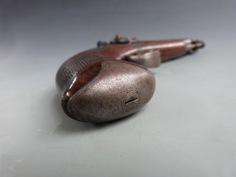 James Calderwood of Dublin Irish percussion hammer action travelling pistol with named and finely engraved lock, engraved hammer, trigger guard, top strap and butt plate, captive ram-rod, chequered grip and 6 inch smooth bored Damascus barrel engraved 'Dublin', overall length 30.5cm.