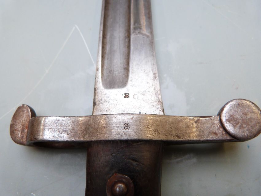 Portuguese 1886 pattern sword bayonet with Steyr 1886 to blade, QQ689 to crosspiece, 47cm fullered yataghan blade and steel scabbard stamped 0320