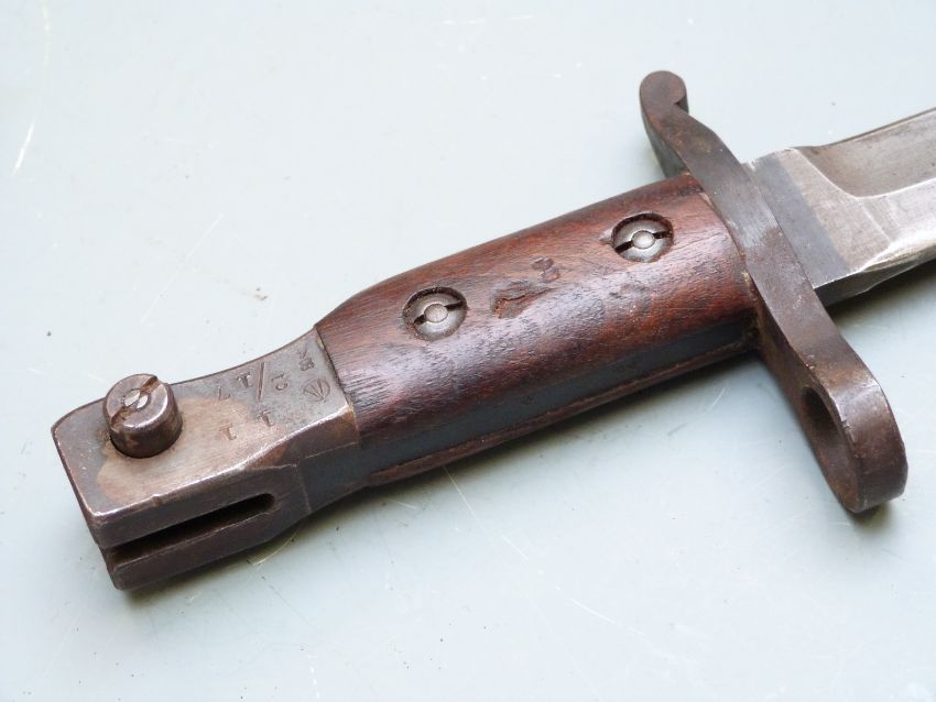Canadian M1910 pattern knife bayonet for the Ross rifle with clear stamps to pommel, 25cm unfullered hatched pointed blade and scabbard with integral frog