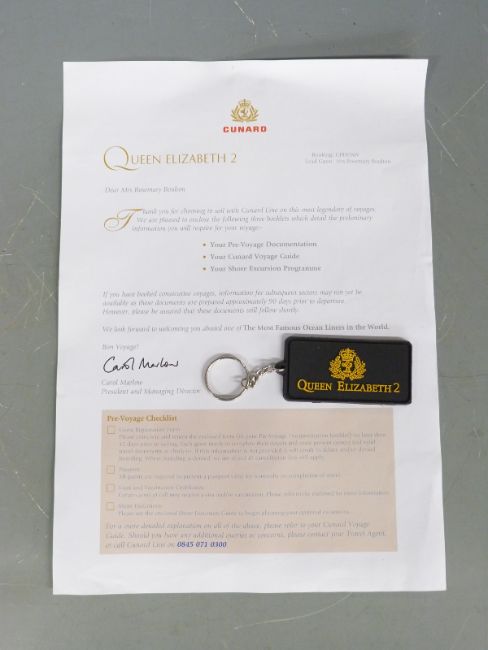A quantity of Cunard memorabilia from the last voyage of the Queen Elizabeth II July 2008. Includes luggage straps, wallets, tea towels, menus, sundry literature, maps etc