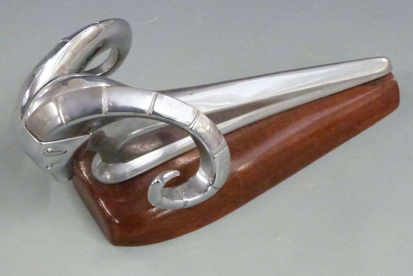 Dodge ram 1950's car mascot or hood ornament, on wooden display base, length 24cm