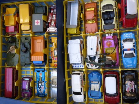 Britains model farm set including three tractors, figures, animals, buildings and accessories together with a Bayko Building Set in original box and a Matchbox Carry Case and diecast model cars.