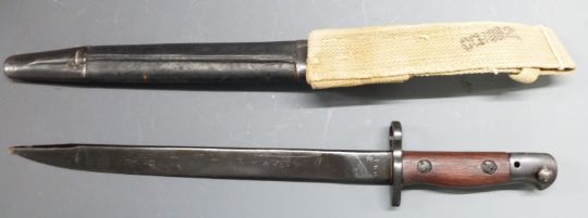 British 1907 pattern bayonet Mk1, stamped to ricasso Wilkinson, with 30cm fullered blade with false edge, scabbard and canvas frog