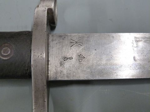 British 1887 pattern Martini Henry sword bayonet Mk3, with clear stamps to ricasso, 46cm unfullered blade, scabbard and frog