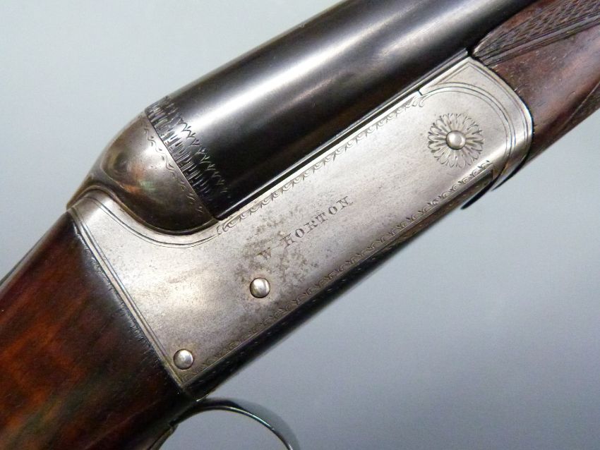 W Horton 12 bore side by side ejector shotgun with named and engraved locks, border engraved trigger guard, underside and top plate, chequered grip and forend, double trigger, vacant cartouche to the underside of the stock and 28 inch barrels, overall length 112cm length of pull 36cm, serial number 2234. PLEASE NOTE THAT A VALID RELEVANT FIREARMS/SHOTGUN CERTIFICATE IS REQUIRED TO HANDLE/PURCHASE THIS ITEM.