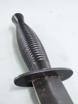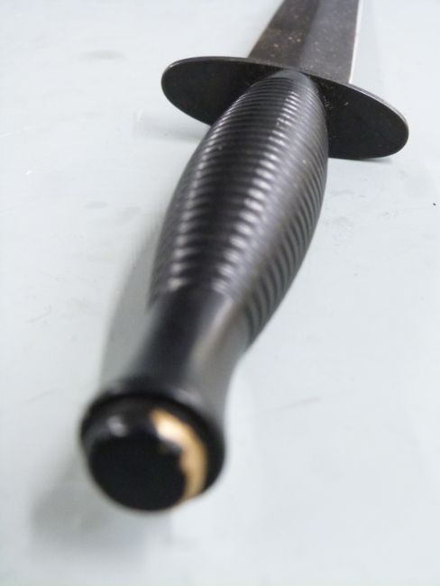 Fairbairn Sykes style fighting knife with ribbed hilt, 18cm blade and leather sheath