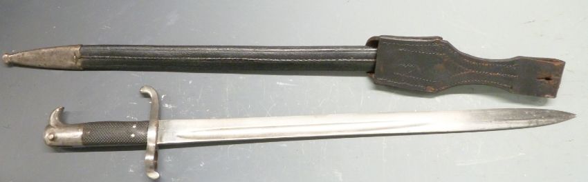 Prussian 1865 pattern Hirschfanger sword bayonet with three securing rivets to grip, Alex Coppel maker's mark to ricasso and 49cm blade, scabbard and frog