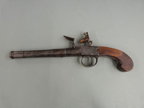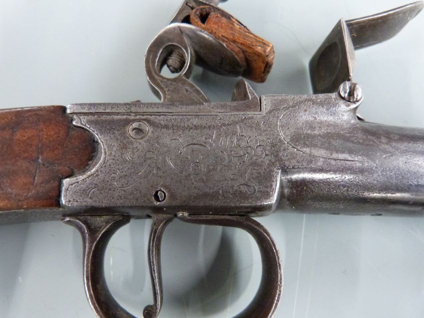 Waters of London Queen Ann flintlock hammer action pistol with named and engraved lock, engraved hammer, stock and top strap, clear 'PRO' 'VED' oroof marks and 6.5 inch turn off smooth bored barrel, overall length 32cm.