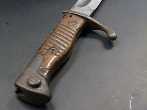 German 1898/05 pattern bayonet later type with muzzle ring trimmed and flashguard, clear stamps, Solingen makers, with 37cm fullered blade and scabbard