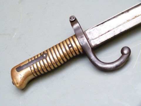 French 1866 pattern chassepot bayonet with downswept quillon stamped 17.L.I.3 to crosspiece, 57cm fullered yataghan blade and scabbard