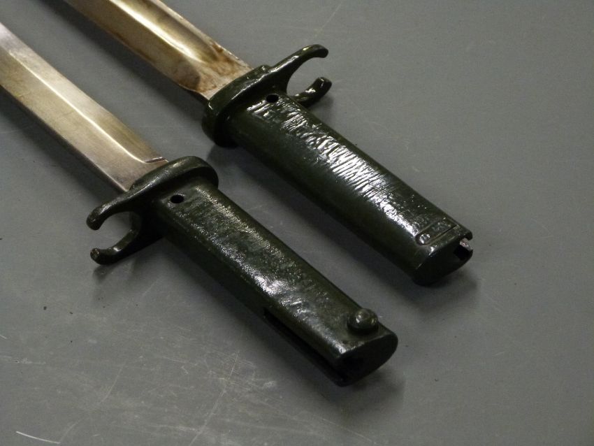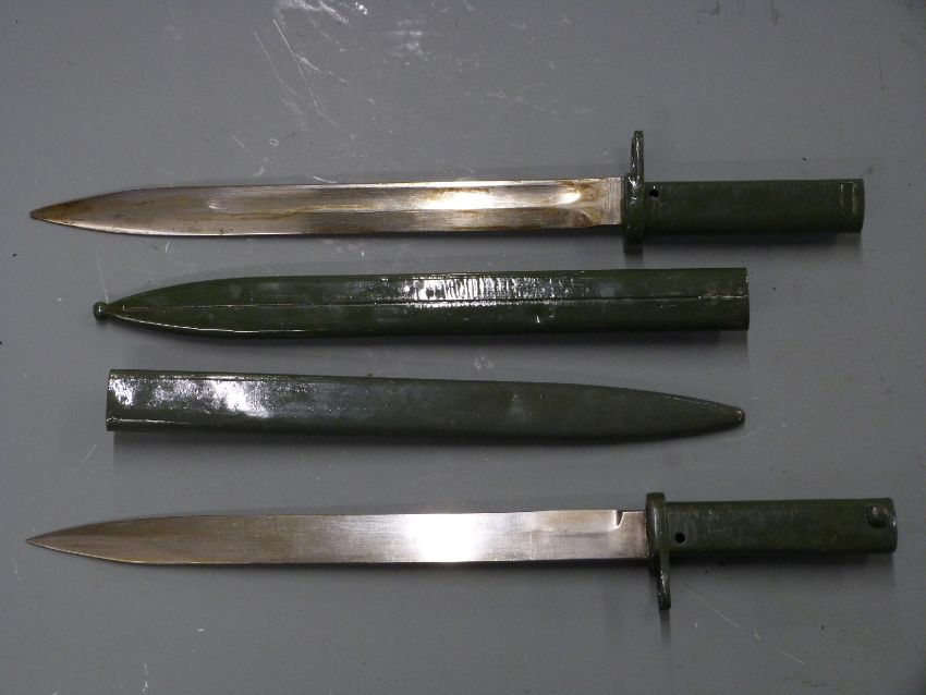 Two German 88/98 pattern Ersatz all steel bayonets, both with 31cm blades, one fullered the unfullered, both with scabbards