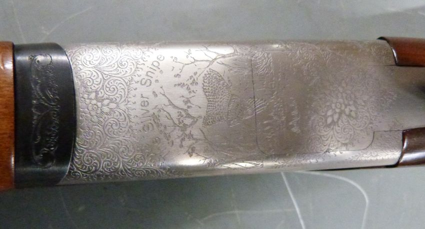 The Silver Snipe 12 bore over and under ejector shotgun with engraved scenes of birds to the lock and underside, engraved trigger guard, top plate and thumb lever, chequered semi-pistol grip and forend, single trigger, vented top and central ribs and 30 inch multi-choke barrels, overall length 119.5cm, length of pull 36cm, serial number 35921. PLEASE NOTE THAT A VALID RELEVANT FIREARMS/SHOTGUN CERTIFICATE IS REQUIRED TO HANDLE/PURCHASE THIS ITEM.