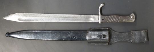 German 1898/05 pattern bayonet later type with trimmed muzzle ring and flashguard, some clear stamps, Amberg makers, 36cm fullered blade, with scabbard and frog