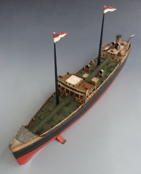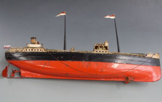 Fleischmann (Germany) clockwork tinplate single Funnel 'Esso Tanker Shipping Company ' ship with red and black hull, white and tan superstructure, two lifeboats, four ventilators and three masts with flags, 51cms length