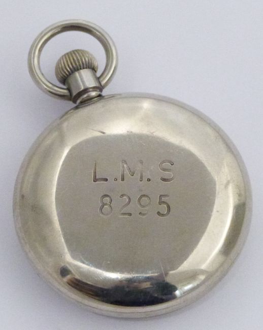London Midland and Scottish railway Record Dreadnaught keyless winding open faced pocket watch with inset subsidiary seconds dial, black Arabic numerals, blued hand, white enamel dial and case back marked ‘LMS 8295’, case diameter 58mm
