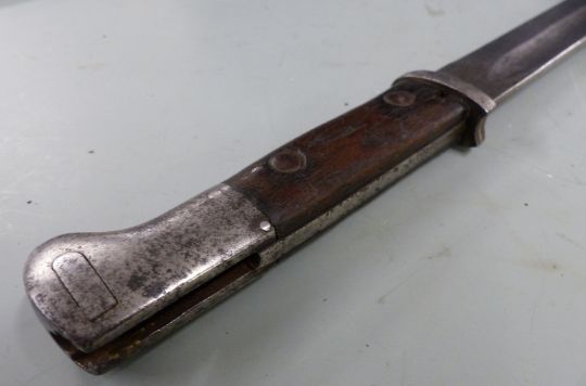 German S 1914 pattern bayonet marked BK within oval to ricasso, with shaped wooden grips, 31cm fullered blade, scabbard and frog