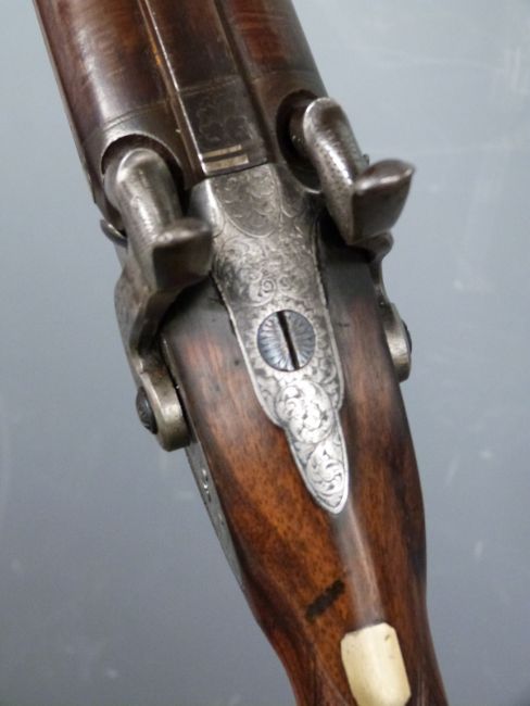 Joseph Manton 14 bore side by side percussion hammer action gun with named and engraved locks, engraved dolphin hammers, top plate, pineapple finialled trigger guard and mounts, chequered grip, vacant wrist cartouche, brass tipped wooden ram-rod, double trigger and 29.5 inch smooth bored Damascus barrels engraved 'Joseph Manton & Son 6 Holt Street Cavendish Square London' overall length 117cm, serial number 10632.