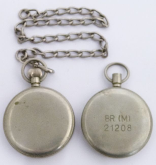 Two British Railways Midland region Phenix keyless winding open faced pocket watches, both with subsidiary seconds dial, black Arabic numerals and white enamel dial, the case backs marked 'B R (M) 21208' and 'B R (M) 22026', largest case diameter 50mm, one on watch chain
