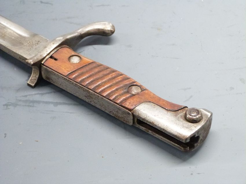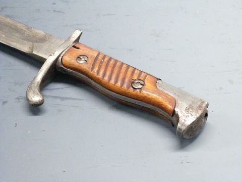 German 1898/05 pattern bayonet with part muzzle ring trimmed and flashguard, some clear stamps, Erfurt makers, 37cm fullered blade, with scabbard and frog