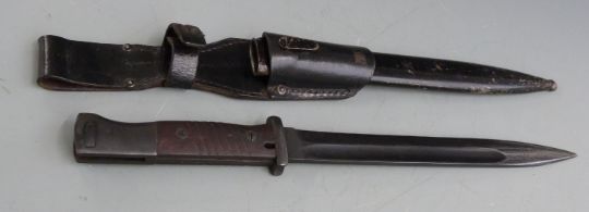 German 84/98 pattern bayonet with grooved grips, 44 FNG 4026 to ricasso, 25cm fullered blade, scabbard and frog