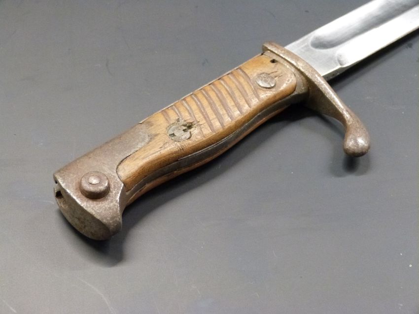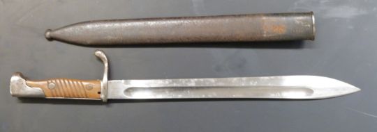 German 1898/05 pattern bayonet later type with muzzle ring trimmed and flashguard, clear stamps, Solingen makers, 37cm fullered blade and scabbard