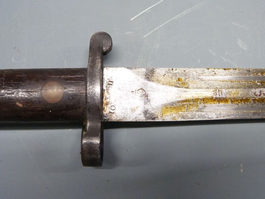 British 1888 pattern bayonet Mk2 with oil hole in pommel, some clean stamps to ricasso, blade length 30cm, with scabbard and frog