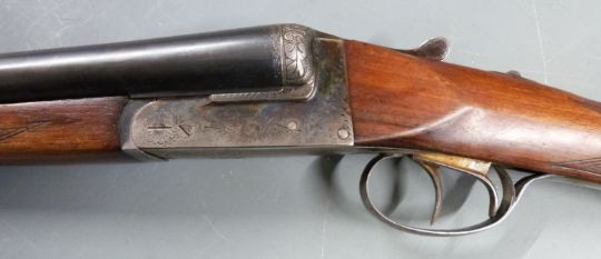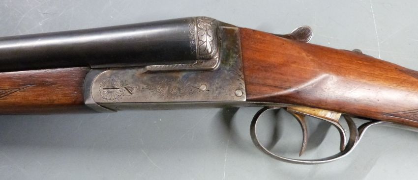 Seguro Spanish 12 bore side by side shotgun with engraved locks, trigger guard, underside and top plate, chequered grip and forend, double trigger and 28 inch barrels choked ¾, overall length 114cm length of pull 37cm, serial number 44824. PLEASE NOTE THAT A VALID RELEVANT FIREARMS/SHOTGUN CERTIFICATE IS REQUIRED TO HANDLE/PURCHASE THIS ITEM.