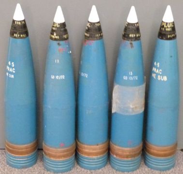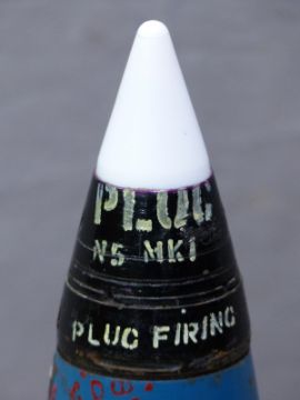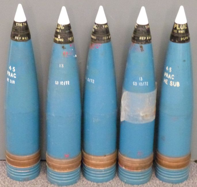 Five British Royal Navy 4.5 inch Mk8 gun practice rounds with fuses marked plug No5 Mk1 TRE76 marked to body 4.5 PRAC HE SUB and dated 1972, overall length 59cm, in travelling crate. Consigned by a Royal Navy museum