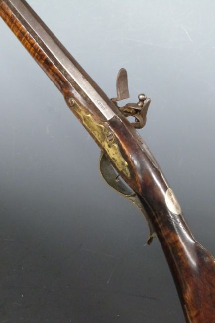 Ketland flintlock Kentucky rifle with named lock, brass trigger guard, butt plate and mounts, engraved brass storage compartment to the stock, brass tipped wooden ram-rod, vacant wrist cartouche and 44 inch smooth bored octagonal barrel stamped 'J.Hein', overall length 152cm.