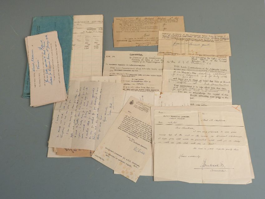 Royal Navy documents, paperwork and ephemera relating to Lt Commander A E B Cheetham RN including education/training certificates, buttons, badges, cigarette case and tie pin for HMS Royal Oak etc