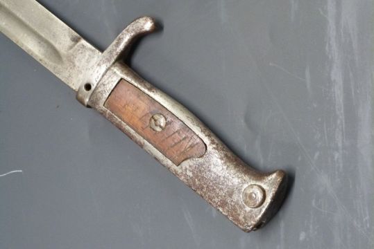 German WWI Ersatz knife bayonet no stamps with small wallnut grips, 31cm fullered blade with scabbard and frog, date stamped Berlin 1915