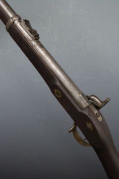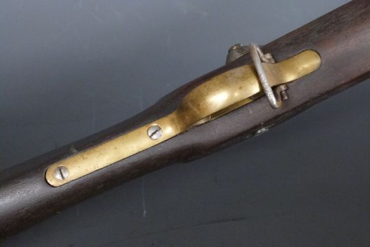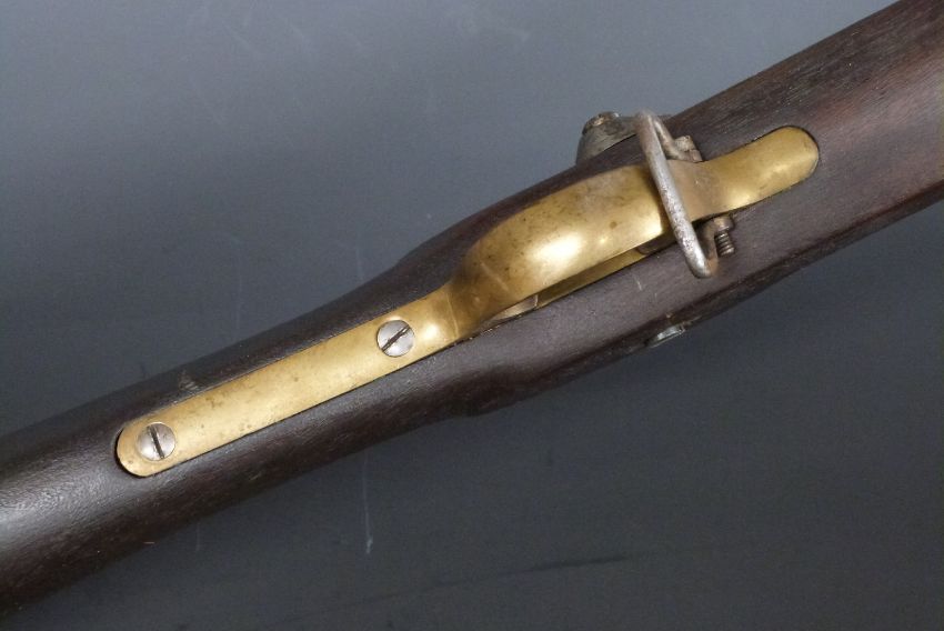 Enfield 1859 pattern percussion hammer action rifle with lock stamped with crown over 'VR' cypher and '1859 Tower', engraved hammer, brass trigger guard and butt plate, sling suspension mounts, pop-up ladder sights, steel ram-rod and 32.75 inch smooth bored barrel, overall length 125cm.