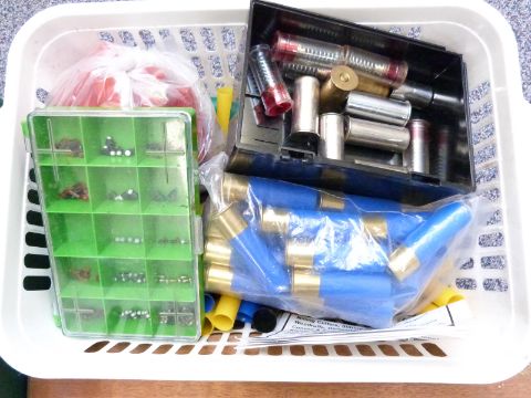 A collection of gun and shooting parts and accessories including air rifle barrels and Gunsport Ox mainsprings, shotgun cartridge cases, ear defenders, display cabinet, snapcaps etc, some in original boxes/ packaging.