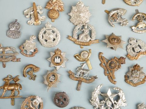 A collection of cap badges, mainly British Infantry regiments including Light Infantry, Gloucestershire Regiment, the King's, the Buffs etc