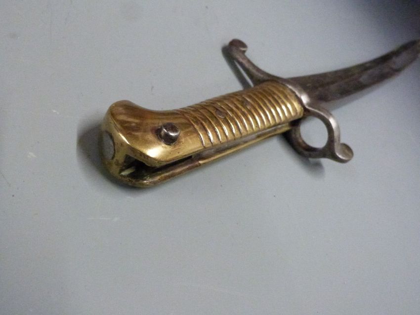 British 1853 pattern Artillery sword/bayonet with maker's mark to ricasso, 58cm yataghan blade, scabbard and frog
