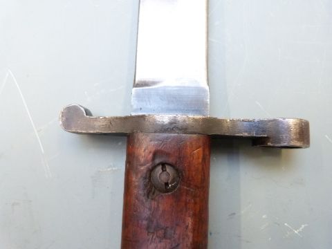 Canadian M1905 pattern knife bayonet with stepped muzzle ring for the Ross rifle, clear stamps to pommel, 25cm unfullered hatched pointed/sharpened blade and scabbard with integral frog