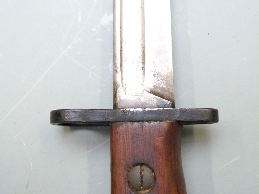 British No8 pattern knife bayonet with shaped wooden grips, 20cm fullered 'bowie' style blade and scabbard