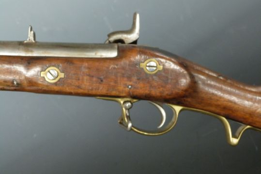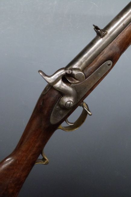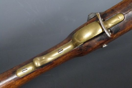 Percussion hammer action rifle with lock stamped with crown over 'VR' cypher and '1864 Tower', brass scrolling trigger guard, storage compartment to stock, butt plate and mounts, steel ram-rod, pop-up sights and 29.75 inch barrel with Brunswick 2-groove rifling, overall length 116cm.